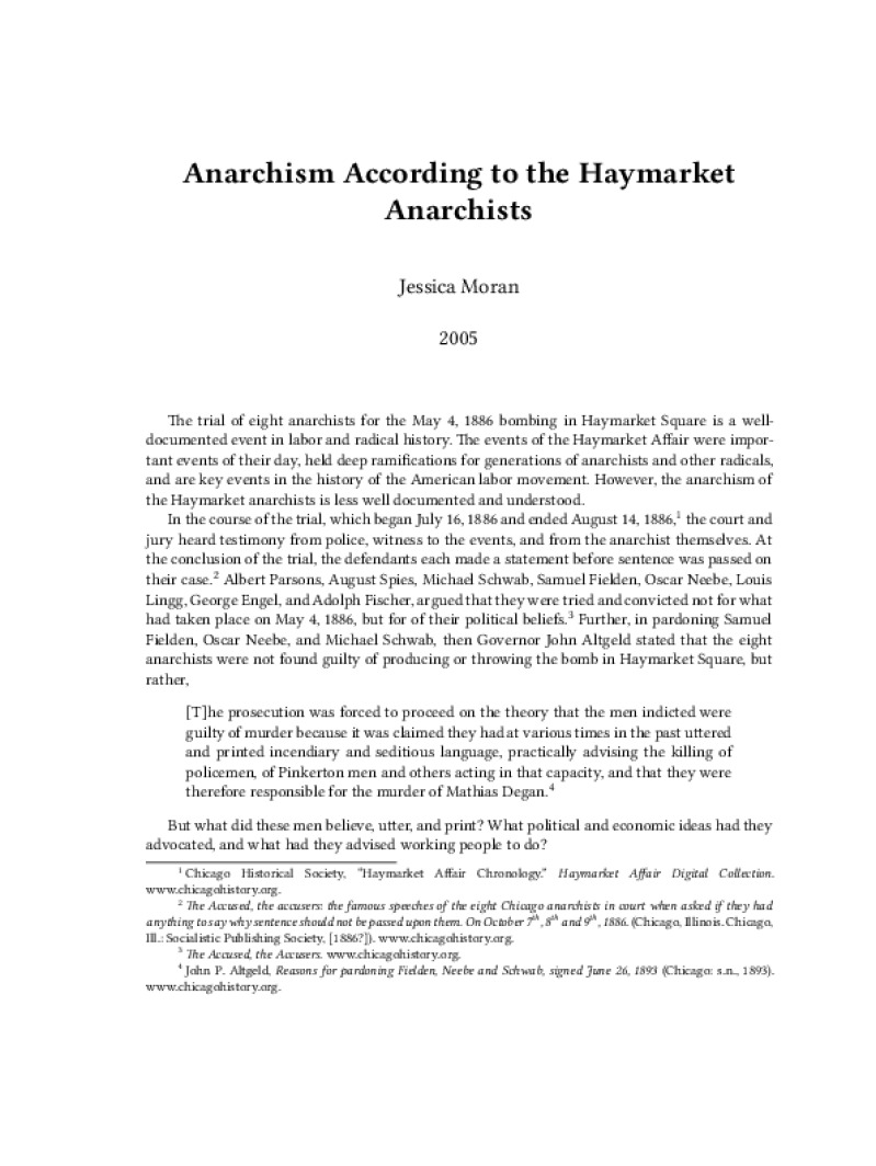 Zine Anarchism According to the Haymarket Anarchists Author: Jessica MoranPublished: 2005Language: enCatalog: The Anarchist Library8 pages. Read online: html • pdf •imposed pdf • a4 pdf • epub • muse • tex Share: We mail all zines to incarcerated people for free.