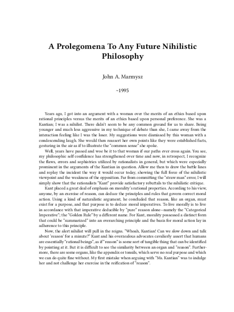 Zine A Prolegomena To Any Future Nihilistic Philosophy Author: John A. MarmyszPublished: ~1995Language: enCatalog: The Anarchist Library6 pages. Read online: html • pdf •imposed pdf • a4 pdf • epub • muse • tex Share: We mail all zines to incarcerated people for free.