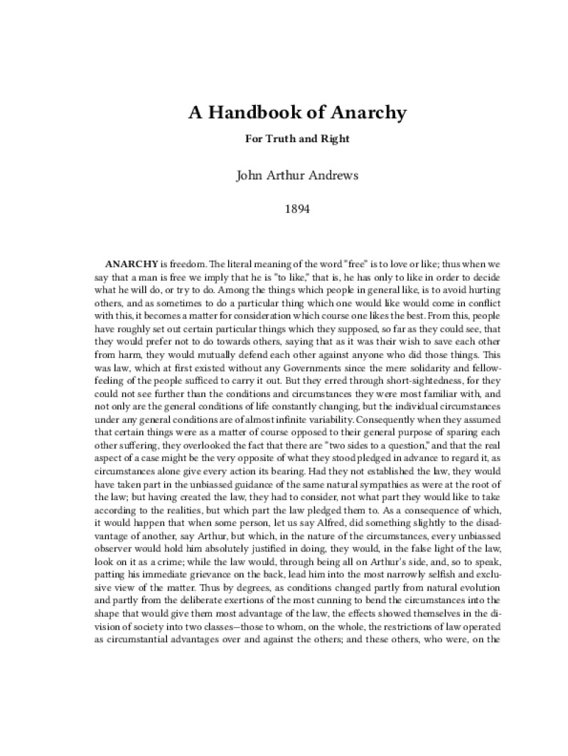 Zine A Handbook of Anarchy Author: John Arthur AndrewsPublished: 1894Language: enCatalog: The Anarchist Library9 pages. Read online: html • pdf •imposed pdf • a4 pdf • epub • muse • tex Share: We mail all zines to incarcerated people for free.