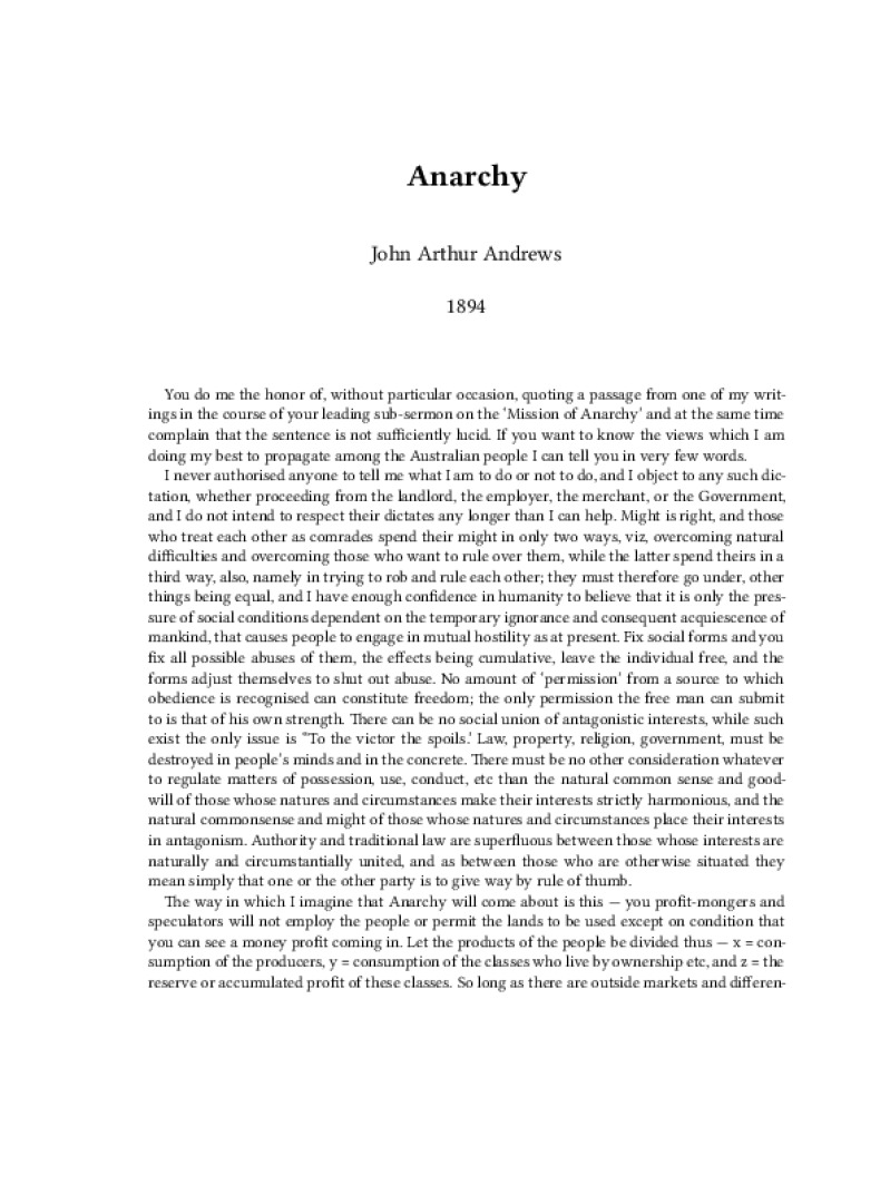 Zine Anarchy Author: John Arthur AndrewsPublished: 1894Language: enCatalog: The Anarchist Library3 pages. Read online: html • pdf •imposed pdf • a4 pdf • epub • muse • tex Share: We mail all zines to incarcerated people for free.
