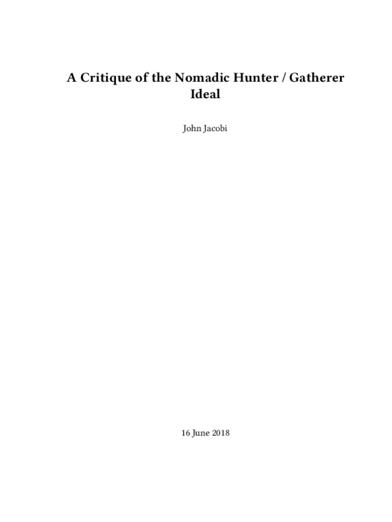 Zine A Critique of the Nomadic Hunter / Gatherer Ideal Author: John JacobiPublished: 16 June 2018Language: enCatalog: The Anarchist Library8 pages. Read online: html • pdf •imposed pdf • a4 pdf • epub • muse • tex Share: We mail all zines to incarcerated people for free.