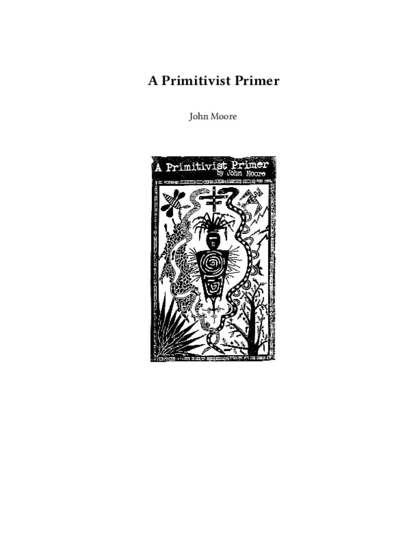 Zine A Primitivist Primer Author: John MooreLanguage: enCatalog: The Anarchist Library9 pages. Read online: html • pdf •imposed pdf • a4 pdf • epub • muse • tex Share: We mail all zines to incarcerated people for free.