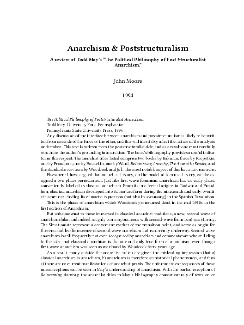 Zine Anarchism & Poststructuralism Author: John MoorePublished: 1994Language: enCatalog: The Anarchist Library6 pages. Read online: html • pdf •imposed pdf • a4 pdf • epub • muse • tex Share: We mail all zines to incarcerated people for free.