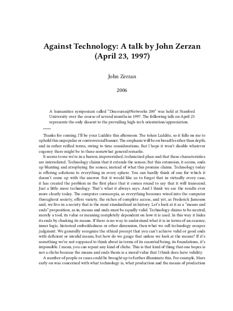 Zine Against Technology: A talk by John Zerzan (April 23, 1997) Author: John ZerzanPublished: 2006Language: enCatalog: The Anarchist Library8 pages. Read online: html • pdf •imposed pdf • a4 pdf • epub • muse • tex Share: We mail all zines to incarcerated people for free.