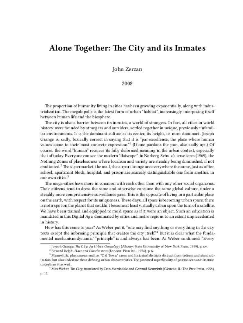 Zine Alone Together: The City and its Inmates Author: John ZerzanPublished: 2008Language: enCatalog: The Anarchist Library7 pages. Read online: html • pdf •imposed pdf • a4 pdf • epub • muse • tex Share: We mail all zines to incarcerated people for free.