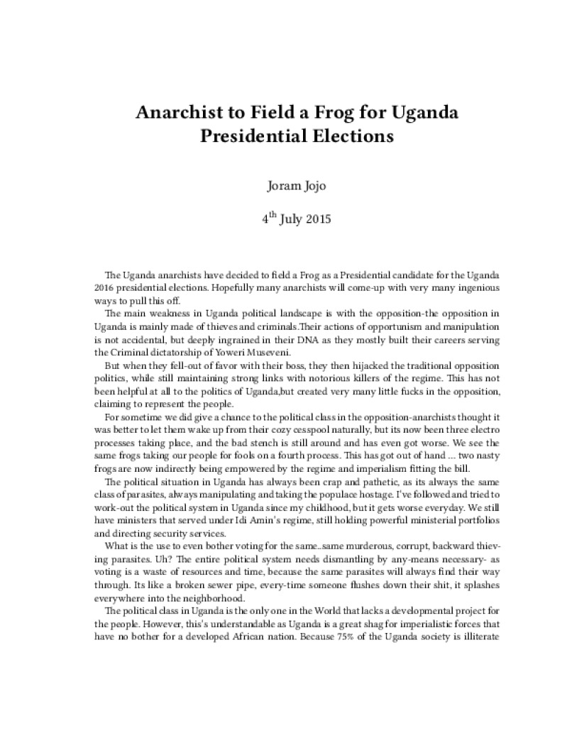 Zine Anarchist to Field a Frog for Uganda Presidential Elections Author: Joram JojoPublished: 4th July 2015Language: enCatalog: The Anarchist Library3 pages. Read online: html • pdf •imposed pdf • a4 pdf • epub • muse • tex Share: We mail all zines to incarcerated people for free.