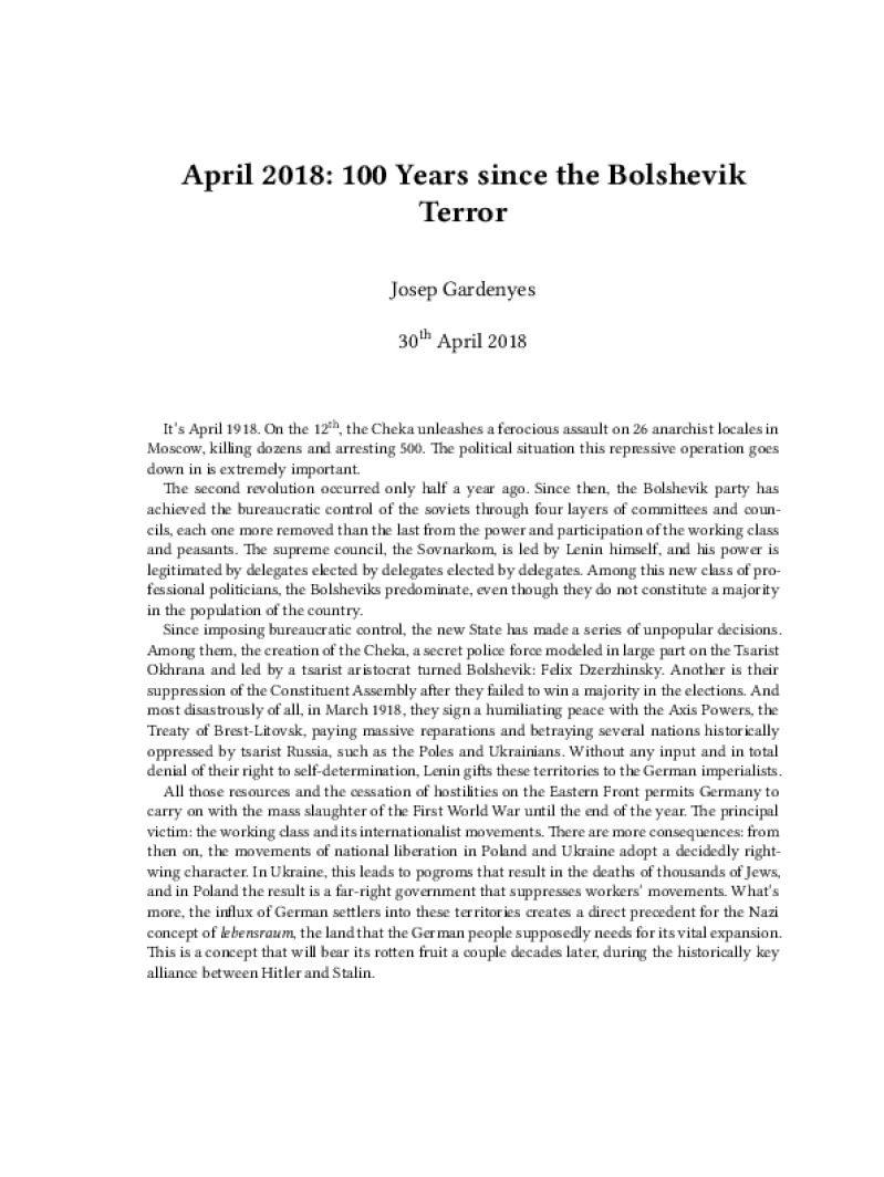 Zine April 2018: 100 Years since the Bolshevik Terror Author: Josep GardenyesPublished: 30th April 2018Language: enCatalog: The Anarchist Library4 pages. Read online: html • pdf •imposed pdf • a4 pdf • epub • muse • tex Share: We mail all zines to incarcerated people for free.