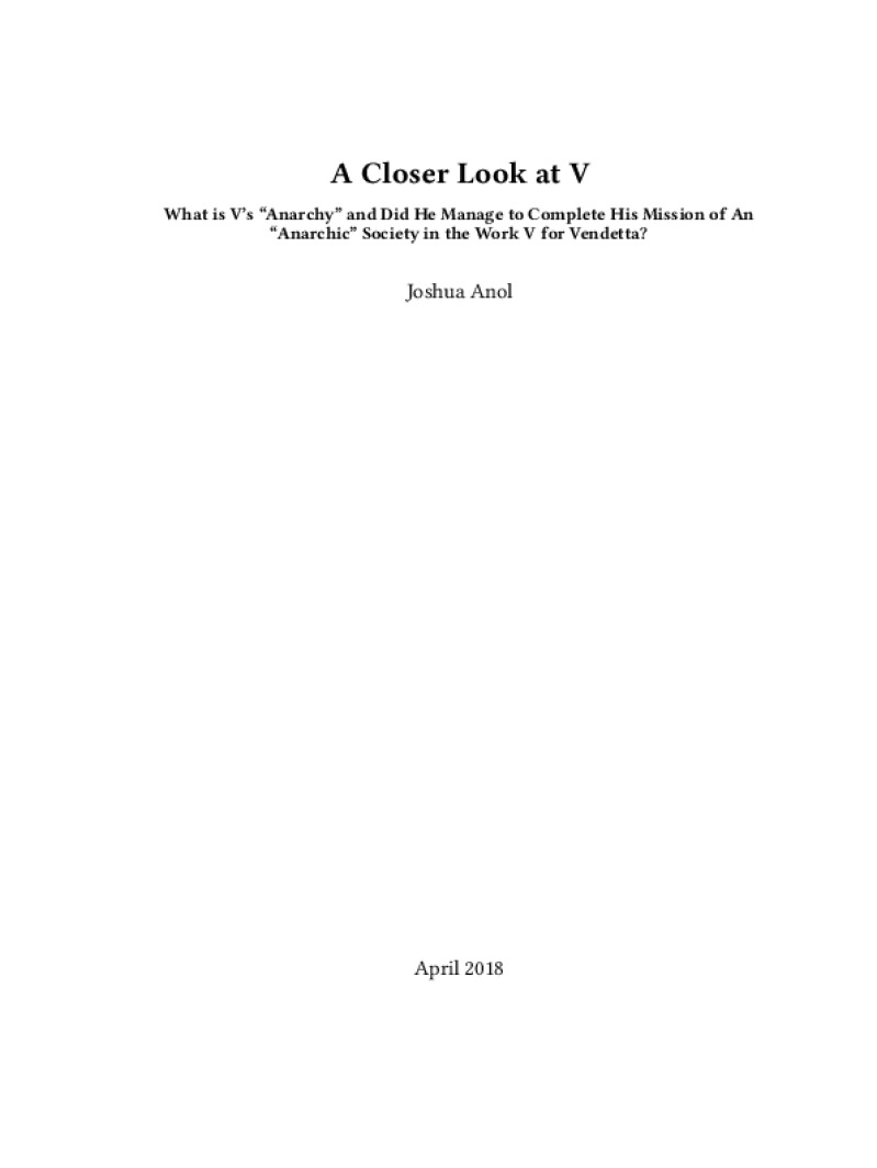 Zine A Closer Look at V Author: Joshua AnolPublished: April 2018Language: enCatalog: The Anarchist Library7 pages. Read online: html • pdf •imposed pdf • a4 pdf • epub • muse • tex Share: We mail all zines to incarcerated people for free.