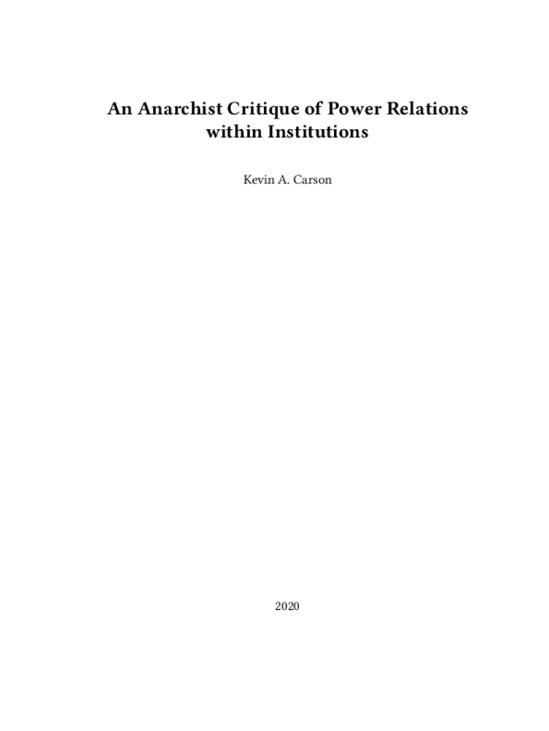 Zine An Anarchist Critique of Power Relations within Institutions Author: Kevin CarsonPublished: 2020Language: enCatalog: The Anarchist Library20 pages. Read online: html • pdf •imposed pdf • a4 pdf • epub • muse • tex Share: We mail all zines to incarcerated people for free.