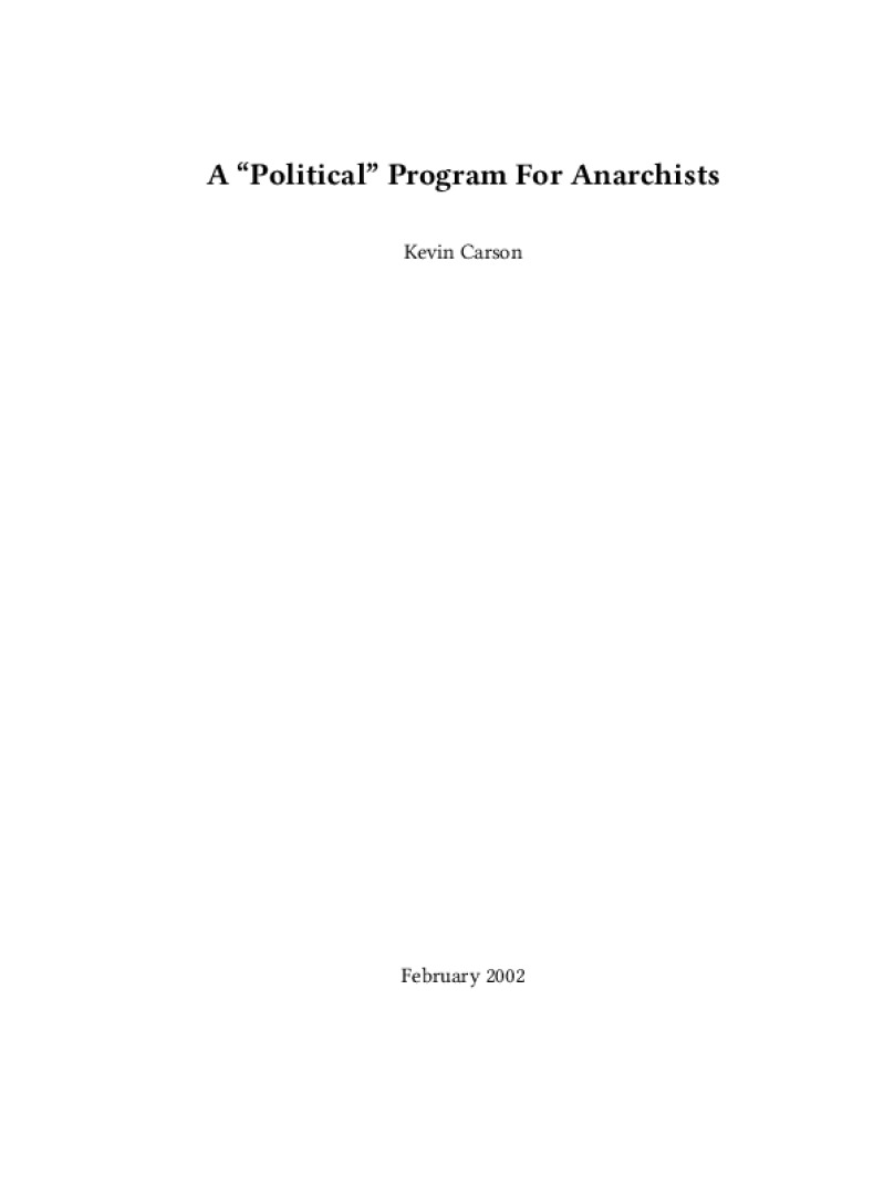 Zine A “Political” Program For Anarchists Author: Kevin CarsonPublished: February 2002Language: enCatalog: The Anarchist Library19 pages. Read online: html • pdf •imposed pdf • a4 pdf • epub • muse • tex Share: We mail all zines to incarcerated people for free.