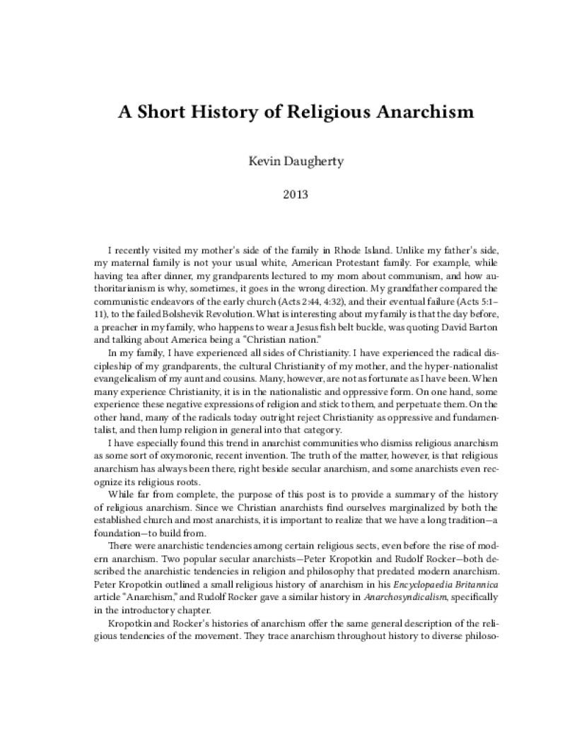 Zine A Short History of Religious Anarchism Author: Kevin DaughertyPublished: 2013Language: enCatalog: The Anarchist Library4 pages. Read online: html • pdf •imposed pdf • a4 pdf • epub • muse • tex Share: We mail all zines to incarcerated people for free.