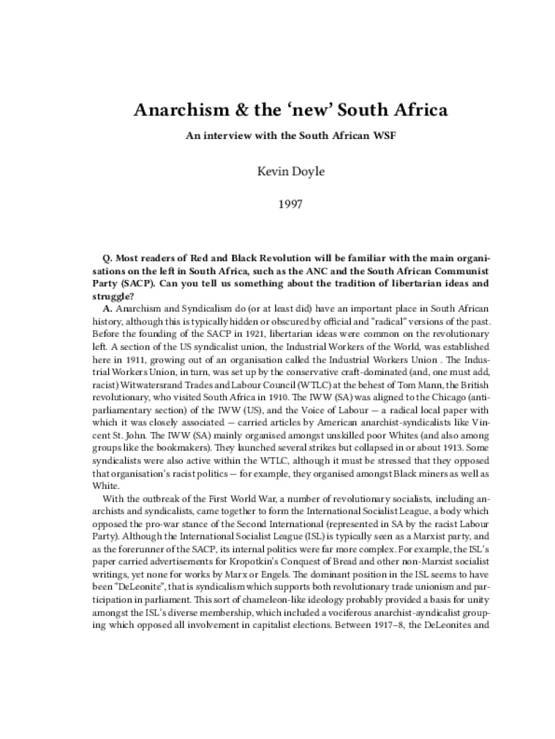 Zine Anarchism & the ‘new’ South Africa Author: Kevin DoylePublished: 1997Language: enCatalog: The Anarchist Library11 pages. Read online: html • pdf •imposed pdf • a4 pdf • epub • muse • tex Share: We mail all zines to incarcerated people for free.