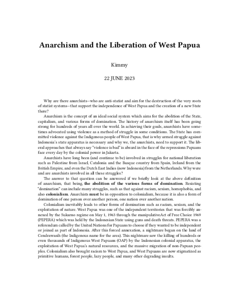 Zine Anarchism and the Liberation of West Papua Author: KimmyPublished: 22 JUNE 2023Language: enCatalog: The Anarchist Library3 pages. Read online: html • pdf •imposed pdf • a4 pdf • epub • muse • tex Share: We mail all zines to incarcerated people for free.