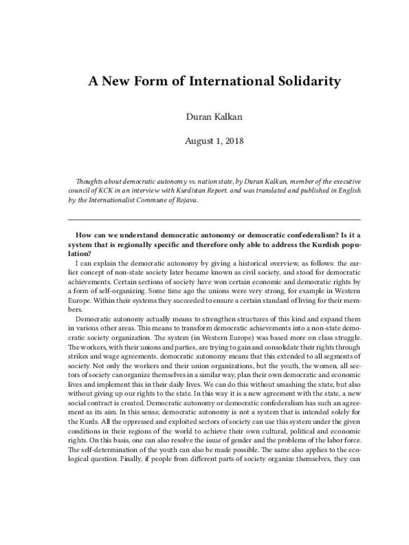 Zine A New Form of International Solidarity Author: Duran KalkanPublished: August 1, 2018Language: enCatalog: The Anarchist Library6 pages. Read online: html • pdf •imposed pdf • a4 pdf • epub • muse • tex Share: We mail all zines to incarcerated people for free.
