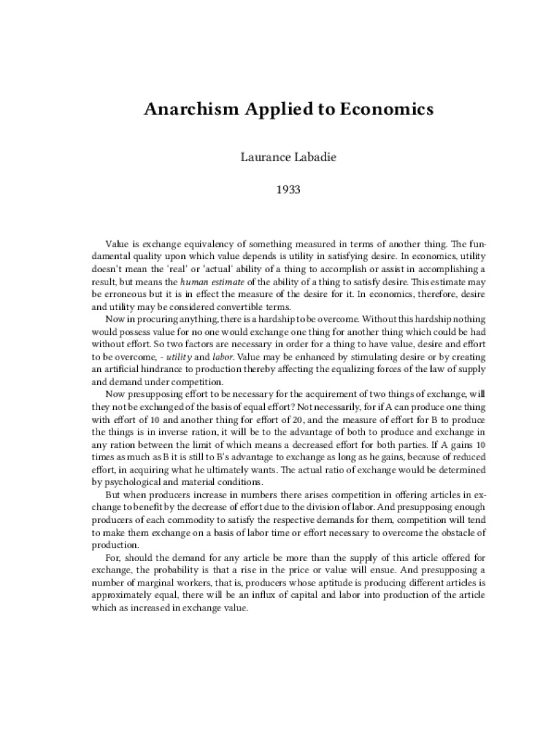 Zine Anarchism Applied to Economics Author: Laurance LabadiePublished: 1933Language: enCatalog: The Anarchist Library4 pages. Read online: html • pdf •imposed pdf • a4 pdf • epub • muse • tex Share: We mail all zines to incarcerated people for free.