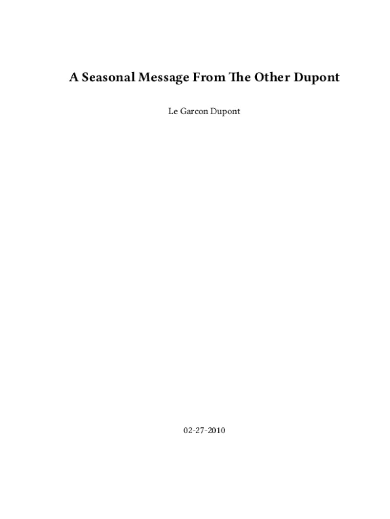 Zine A Seasonal Message From The Other Dupont Author: Le Garcon Dupont Published: 02-27-2010Language: enCatalog: The Anarchist Library14 pages. Read online: html • pdf •imposed pdf • a4 pdf • epub • muse • tex Share: We mail all zines to incarcerated people for free.