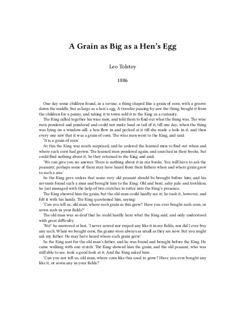 Zine A Grain as Big as a Hen's Egg Author: Leo TolstoyPublished: 1886Language: enCatalog: The Anarchist Library3 pages. Read online: html • pdf •imposed pdf • a4 pdf • epub • muse • tex Share: We mail all zines to incarcerated people for free.