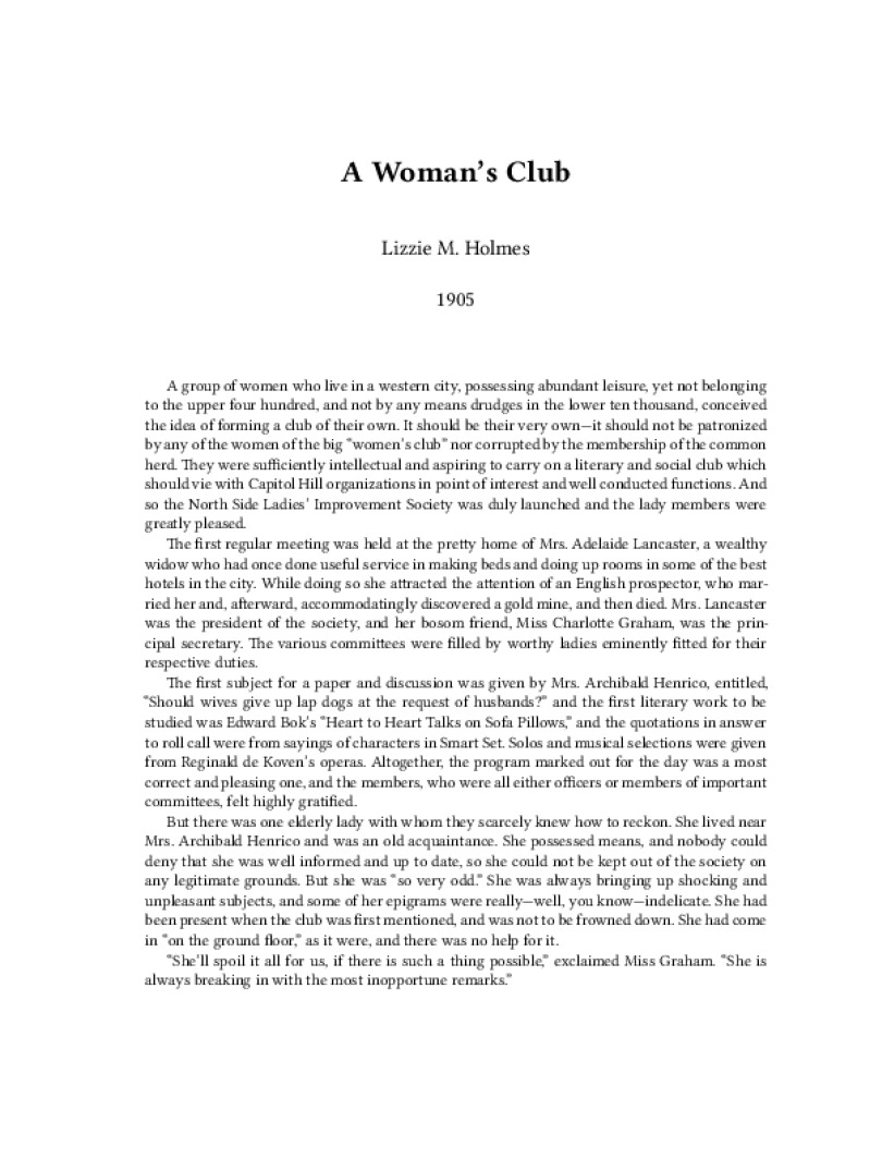 Zine A Woman’s Club Author: Lizzie M. HolmesPublished: 1905Language: enCatalog: The Anarchist Library5 pages. Read online: html • pdf •imposed pdf • a4 pdf • epub • muse • tex Share: We mail all zines to incarcerated people for free.