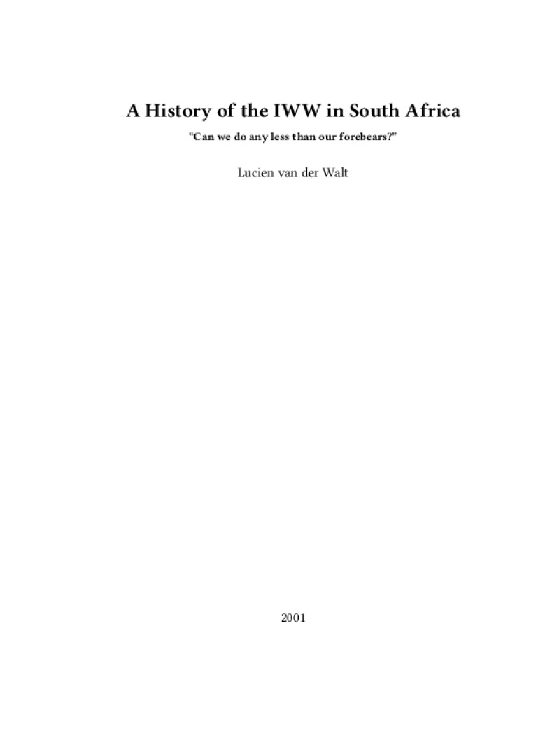 Zine A History of the IWW in South Africa Author: Lucien van der WaltPublished: 2001Language: enCatalog: The Anarchist Library9 pages. Read online: html • pdf •imposed pdf • a4 pdf • epub • muse • tex Share: We mail all zines to incarcerated people for free.
