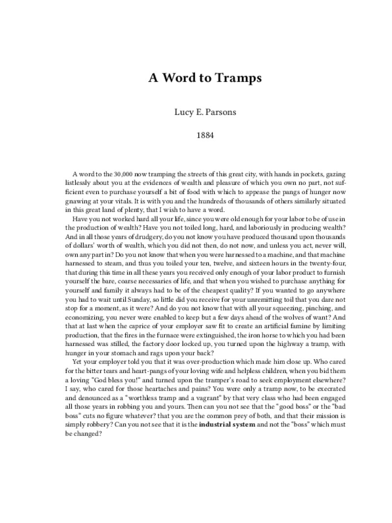 Zine A Word to Tramps Author: Lucy E. ParsonsPublished: 1884Language: enCatalog: The Anarchist Library3 pages. Read online: html • pdf •imposed pdf • a4 pdf • epub • muse • tex Share: We mail all zines to incarcerated people for free.