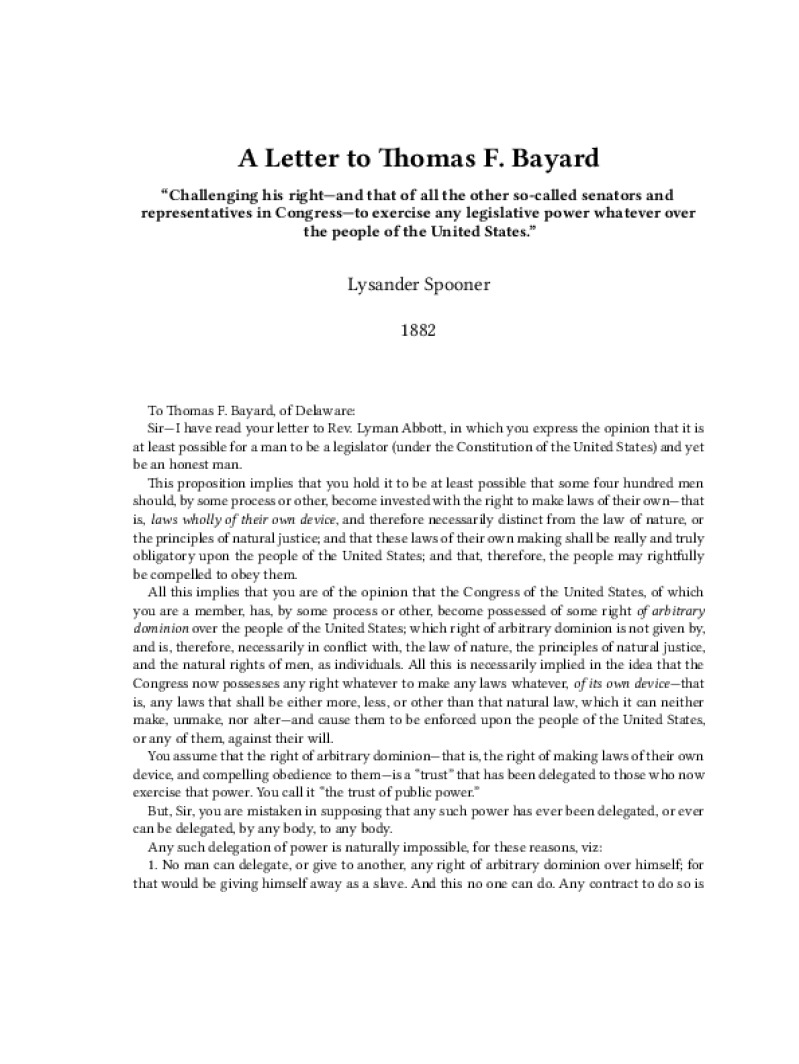 Zine A Letter to Thomas F. Bayard Author: Lysander SpoonerPublished: 1882Language: enCatalog: The Anarchist Library6 pages. Read online: html • pdf •imposed pdf • a4 pdf • epub • muse • tex Share: We mail all zines to incarcerated people for free.