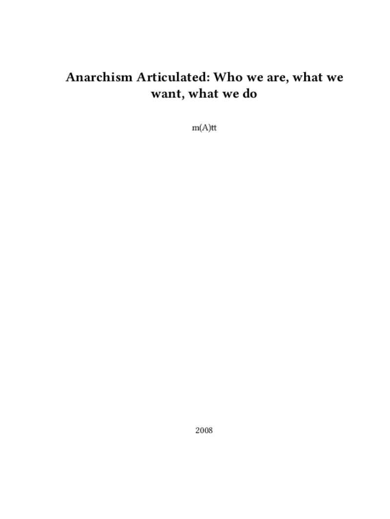 Zine Anarchism Articulated: Who we are, what we want, what we do Author: m(A)ttPublished: 2008Language: enCatalog: The Anarchist Library12 pages. Read online: html • pdf •imposed pdf • a4 pdf • epub • muse • tex Share: We mail all zines to incarcerated people for free.