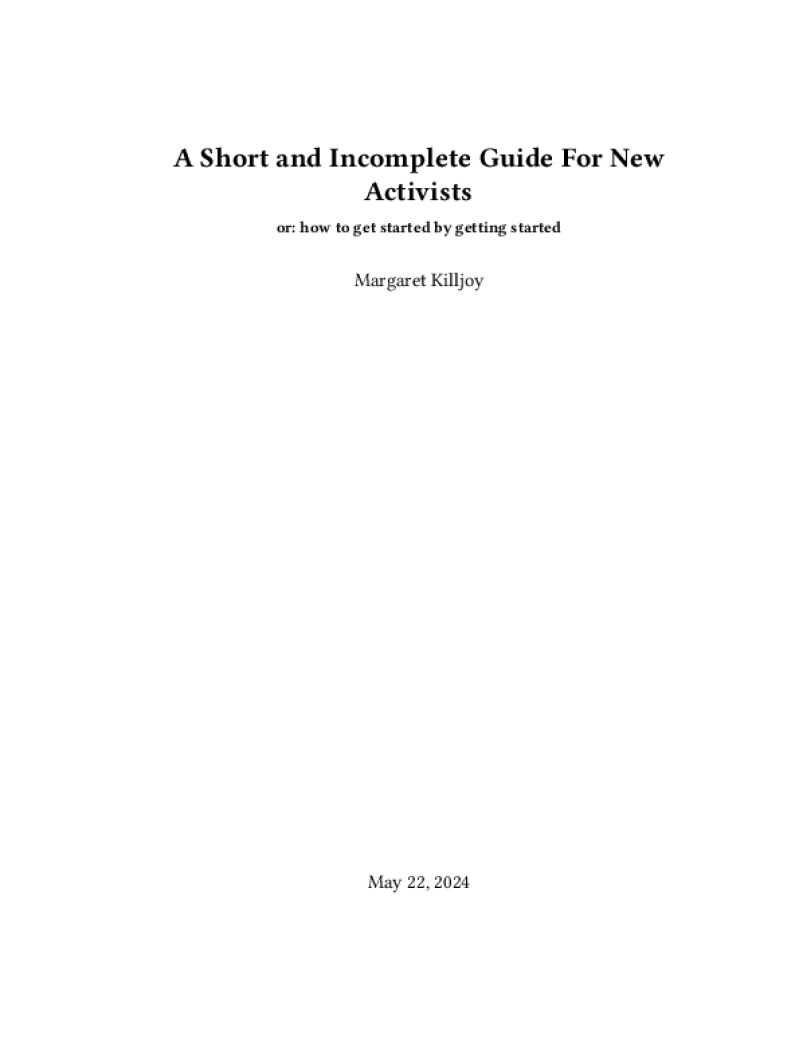 Zine A Short and Incomplete Guide For New Activists Author: Margaret KilljoyPublished: May 22, 2024Language: enCatalog: The Anarchist Library9 pages. Read online: html • pdf •imposed pdf • a4 pdf • epub • muse • tex Share: We mail all zines to incarcerated people for free.
