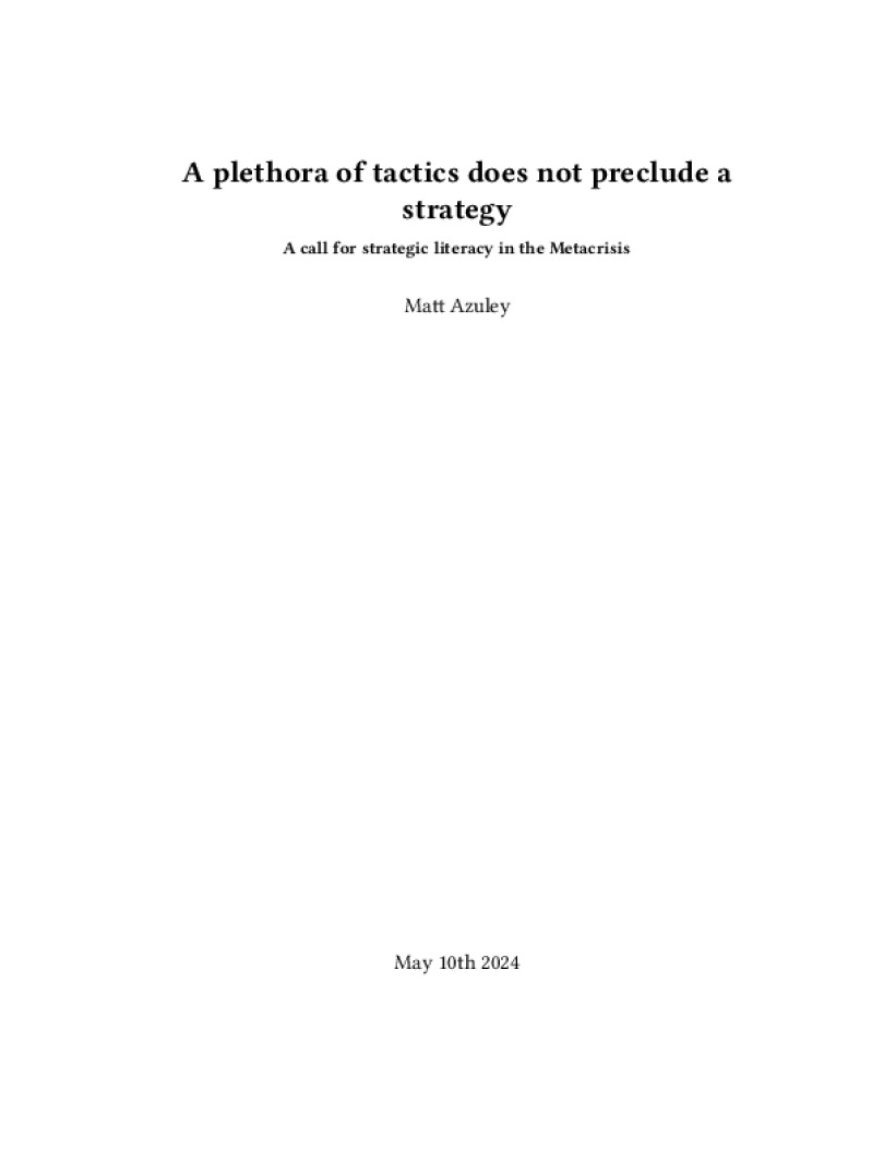 Zine A plethora of tactics does not preclude a strategy Author: Matt AzuleyPublished: May 10th 2024Language: enCatalog: The Anarchist Library16 pages. Read online: html • pdf •imposed pdf • a4 pdf • epub • muse • tex Share: We mail all zines to incarcerated people for free.