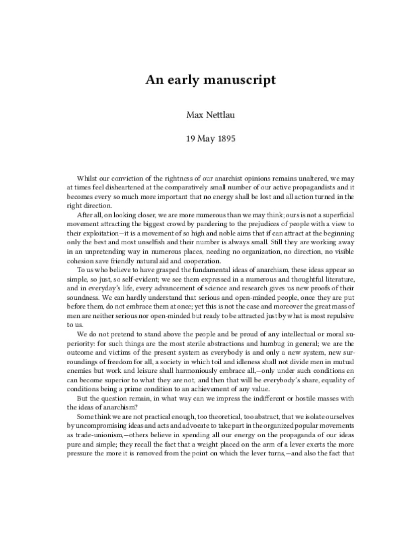 Zine An early manuscript Author: Max NettlauPublished: 19 May 1895Language: enCatalog: The Anarchist Library5 pages. Read online: html • pdf •imposed pdf • a4 pdf • epub • muse • tex Share: We mail all zines to incarcerated people for free.