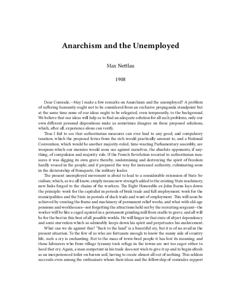 Zine Anarchism and the Unemployed Author: Max NettlauPublished: 1908Language: enCatalog: The Anarchist Library3 pages. Read online: html • pdf •imposed pdf • a4 pdf • epub • muse • tex Share: We mail all zines to incarcerated people for free.