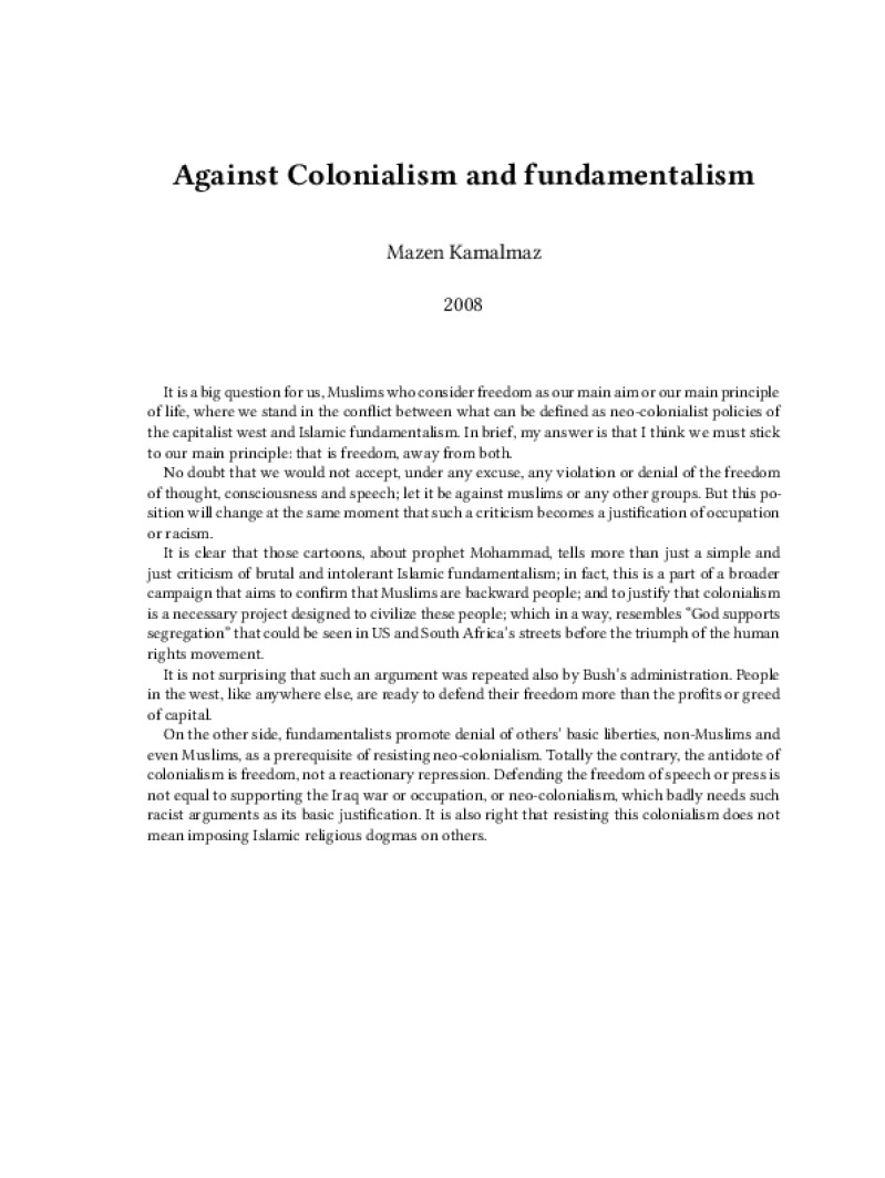 Zine Against Colonialism and fundamentalism Author: Mazen KamalmazPublished: 2008Language: enCatalog: The Anarchist Library2 pages. Read online: html • pdf •imposed pdf • a4 pdf • epub • muse • tex Share: We mail all zines to incarcerated people for free.