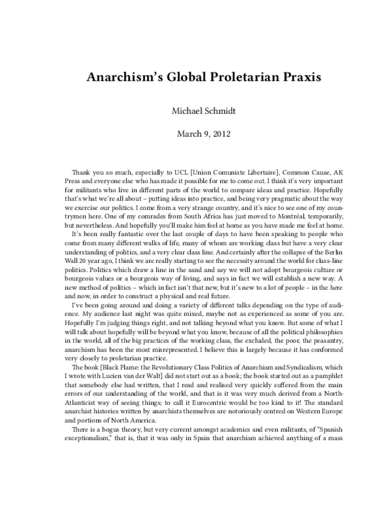 Zine Anarchism’s Global Proletarian Praxis Author: Michael SchmidtPublished: March 9, 2012Language: enCatalog: The Anarchist Library10 pages. Read online: html • pdf •imposed pdf • a4 pdf • epub • muse • tex Share: We mail all zines to incarcerated people for free.
