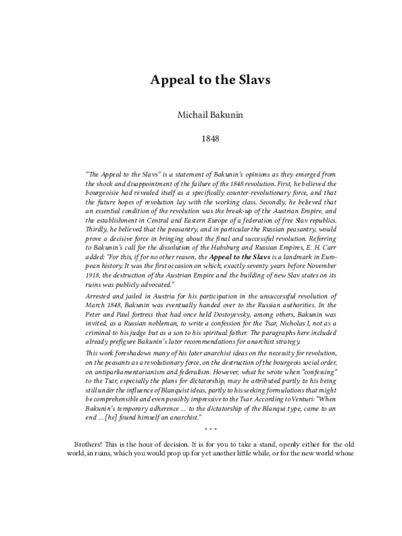 Zine Appeal to the Slavs Author: Michail BakuninPublished: 1848Language: enCatalog: The Anarchist Library6 pages. Read online: html • pdf •imposed pdf • a4 pdf • epub • muse • tex Share: We mail all zines to incarcerated people for free.