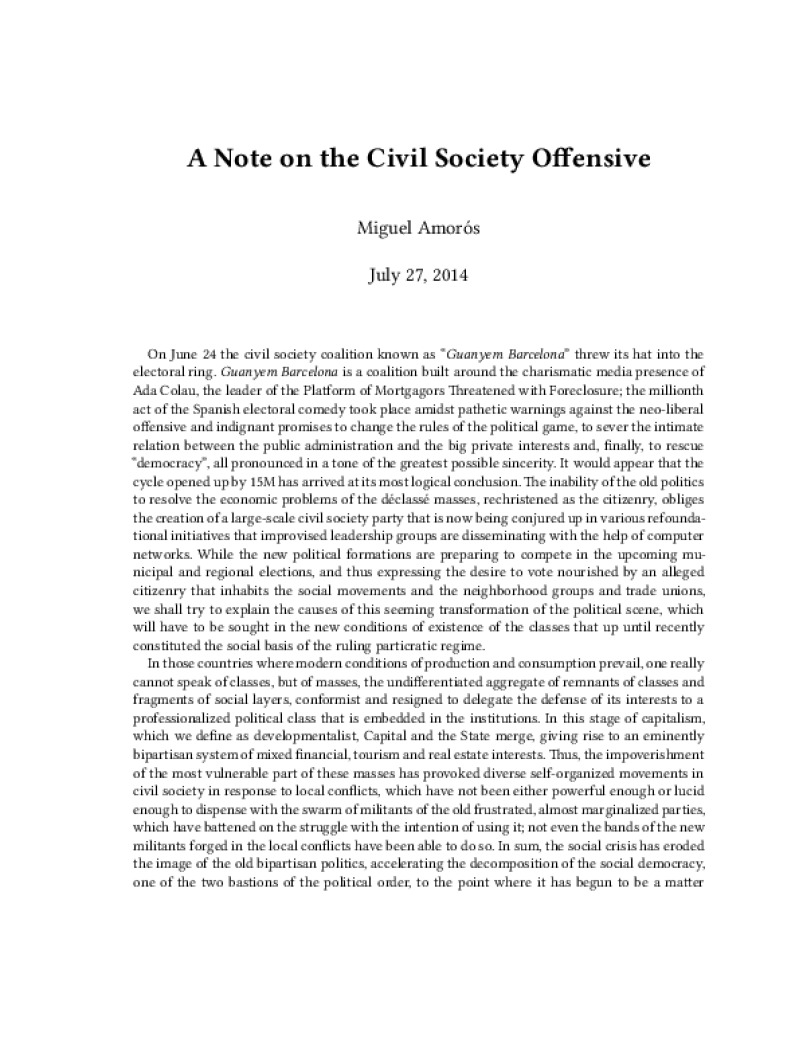 Zine A Note on the Civil Society Offensive Author: Miguel AmorósPublished: July 27, 2014Language: enCatalog: The Anarchist Library4 pages. Read online: html • pdf •imposed pdf • a4 pdf • epub • muse • tex Share: We mail all zines to incarcerated people for free.