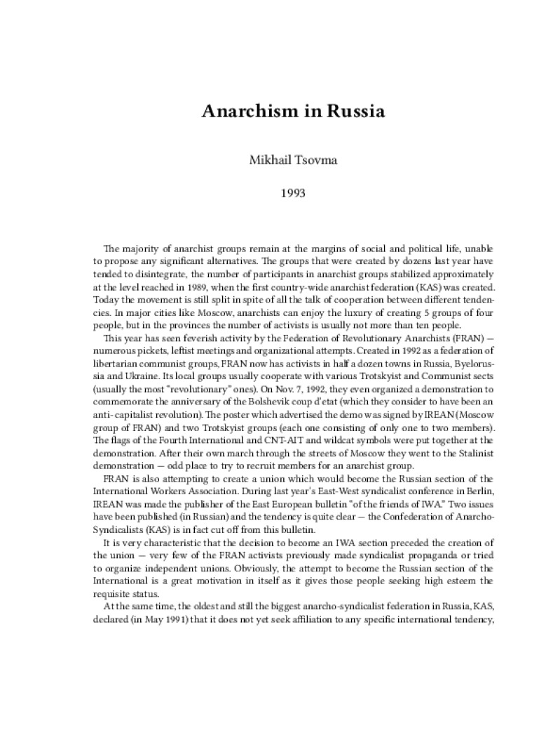 Zine Anarchism in Russia Author: Mikhail TsovmaPublished: 1993Language: enCatalog: The Anarchist Library4 pages. Read online: html • pdf •imposed pdf • a4 pdf • epub • muse • tex Share: We mail all zines to incarcerated people for free.