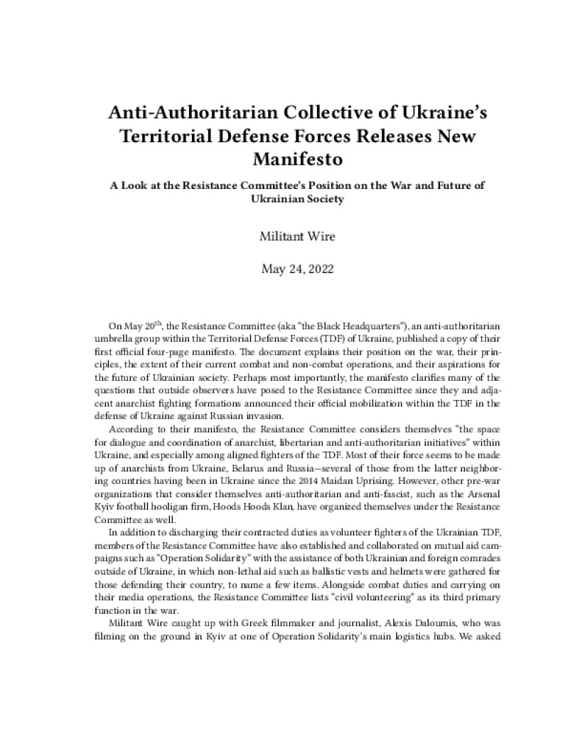 Zine Anti-Authoritarian Collective of Ukraine’s Territorial Defense Forces Releases New Manifesto Author: Militant WirePublished: May 24, 2022Language: enCatalog: The Anarchist Library4 pages. Read online: html • pdf •imposed pdf • a4 pdf • epub • muse • tex Share: We mail all zines to incarcerated people for free.