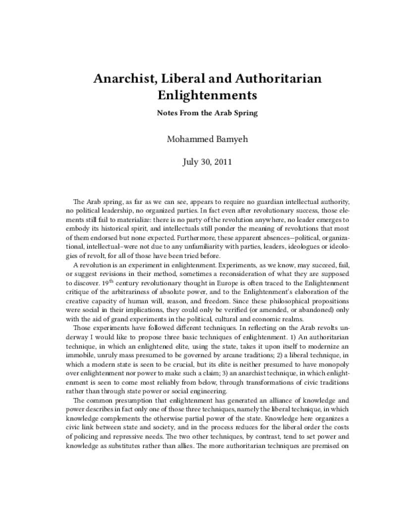 Zine Anarchist, Liberal and Authoritarian Enlightenments Author: Mohammed BamyehPublished: July 30, 2011Language: enCatalog: The Anarchist Library5 pages. Read online: html • pdf •imposed pdf • a4 pdf • epub • muse • tex Share: We mail all zines to incarcerated people for free.