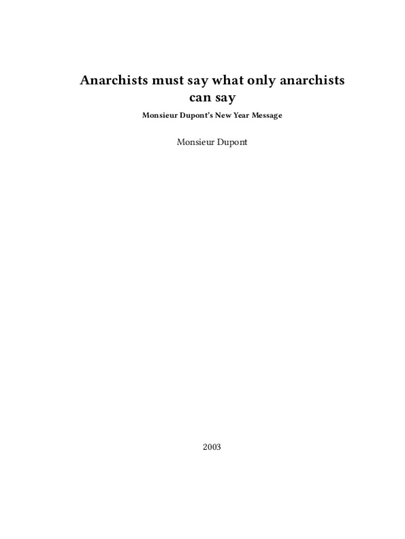 Zine Anarchists must say what only anarchists can say Author: Monsieur DupontPublished: 2003Language: enCatalog: The Anarchist Library11 pages. Read online: html • pdf •imposed pdf • a4 pdf • epub • muse • tex Share: We mail all zines to incarcerated people for free.