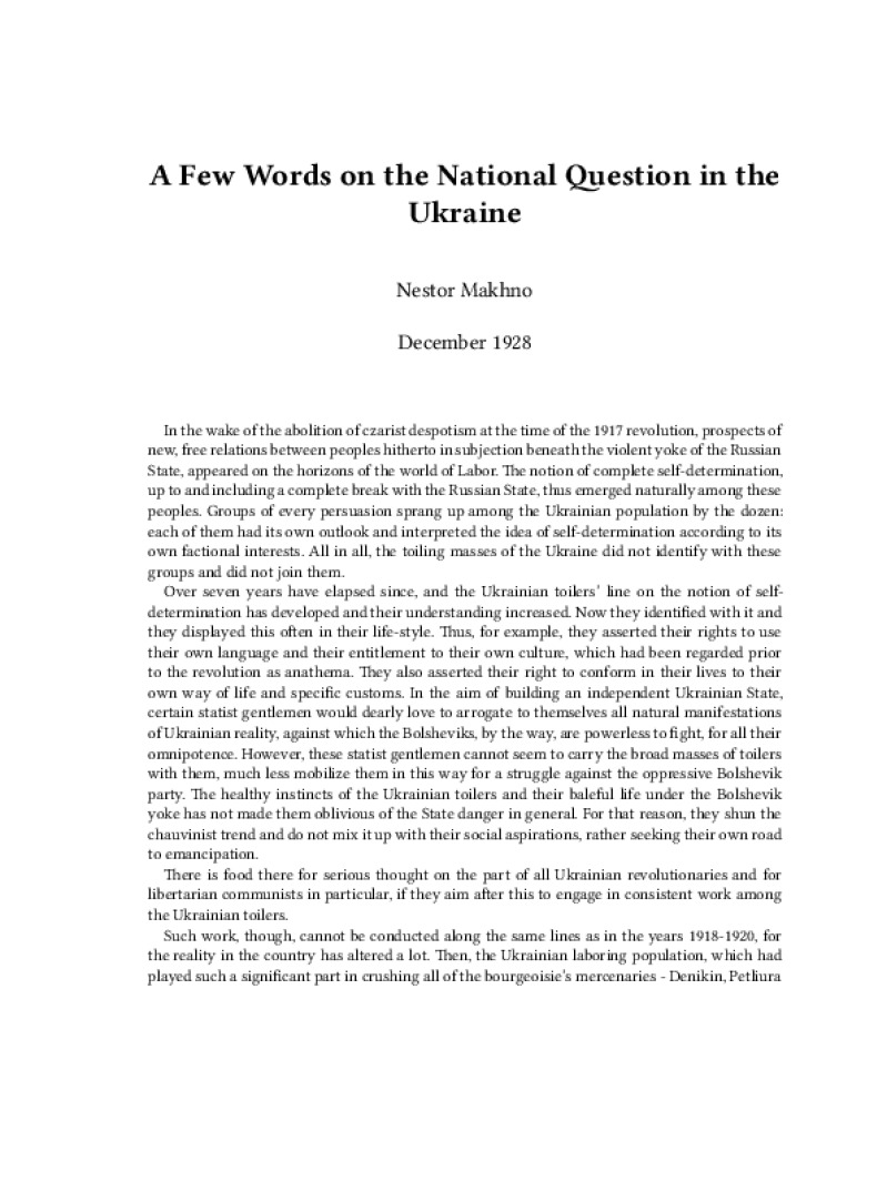 Zine A Few Words on the National Question in the Ukraine Author: Nestor MakhnoPublished: December 1928Language: enCatalog: The Anarchist Library4 pages. Read online: html • pdf •imposed pdf • a4 pdf • epub • muse • tex Share: We mail all zines to incarcerated people for free.
