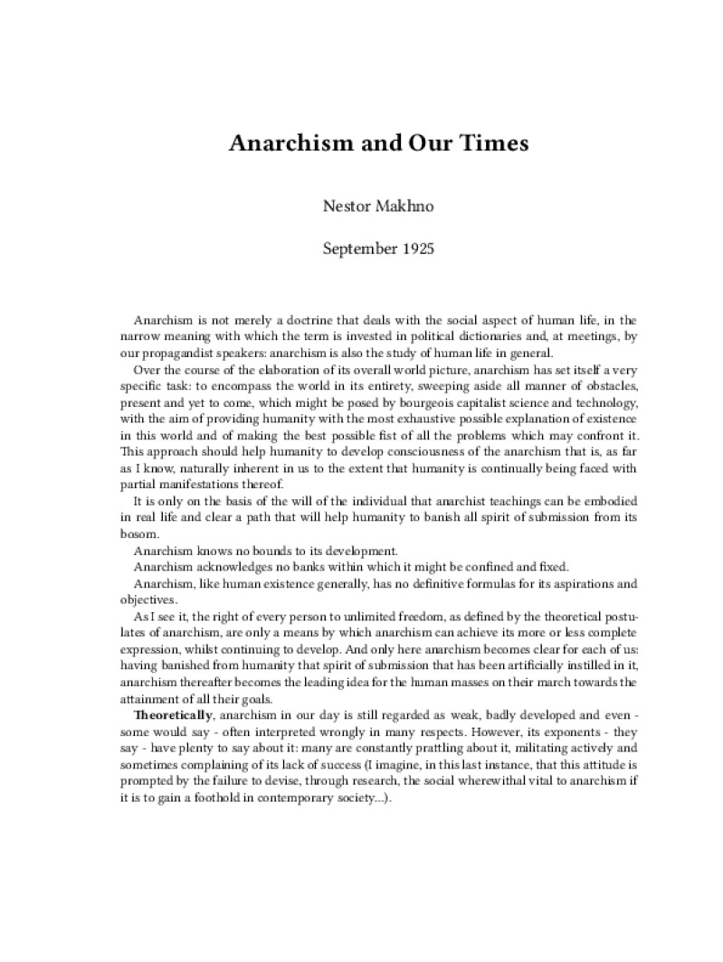 Zine Anarchism and Our Times Author: Nestor MakhnoPublished: September 1925Language: enCatalog: The Anarchist Library3 pages. Read online: html • pdf •imposed pdf • a4 pdf • epub • muse • tex Share: We mail all zines to incarcerated people for free.