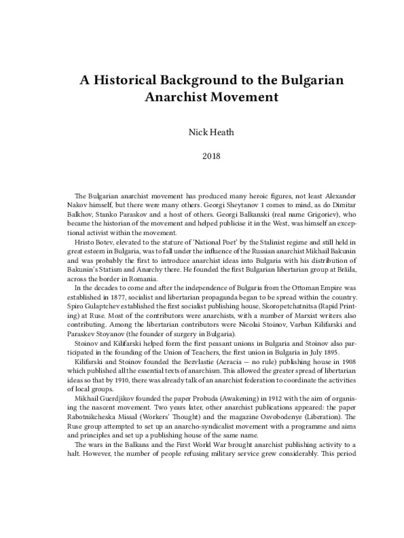 Zine A Historical Background to the Bulgarian Anarchist Movement Author: Nick HeathPublished: 2018Language: enCatalog: The Anarchist Library4 pages. Read online: html • pdf •imposed pdf • a4 pdf • epub • muse • tex Share: We mail all zines to incarcerated people for free.