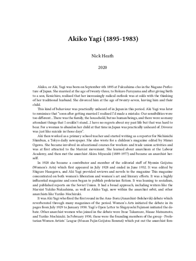 Zine Akiko Yagi (1895-1983) Author: Nick HeathPublished: 2020Language: enCatalog: The Anarchist Library4 pages. Read online: html • pdf •imposed pdf • a4 pdf • epub • muse • tex Share: We mail all zines to incarcerated people for free.