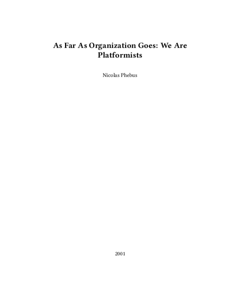 Zine As Far As Organization Goes: We Are Platformists Author: Nicolas PhebusPublished: 2001Language: enCatalog: The Anarchist Library8 pages. Read online: html • pdf •imposed pdf • a4 pdf • epub • muse • tex Share: We mail all zines to incarcerated people for free.