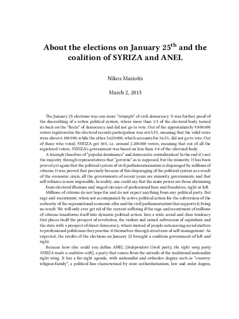 Zine About the elections on January 25th and the coalition of SYRIZA and ANEL Author: Nikos MaziotisPublished: March 2, 2015Language: enCatalog: The Anarchist Library5 pages. Read online: html • pdf •imposed pdf • a4 pdf • epub • muse • tex Share: We mail all zines to incarcerated people for free.