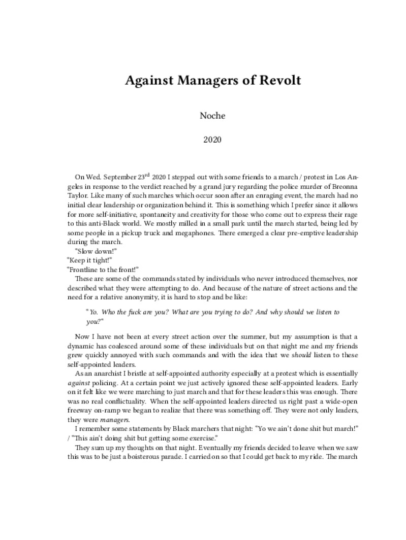 Zine Against Managers of Revolt Author: NochePublished: 2020Language: enCatalog: The Anarchist Library3 pages. Read online: html • pdf •imposed pdf • a4 pdf • epub • muse • tex Share: We mail all zines to incarcerated people for free.