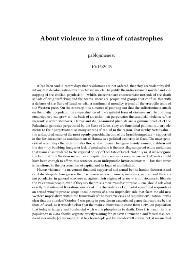 Zine About violence in a time of catastrophes Author: pablojimenezcPublished: 10/16/2023Language: enCatalog: The Anarchist Library4 pages. Read online: html • pdf •imposed pdf • a4 pdf • epub • muse • tex Share: We mail all zines to incarcerated people for free.