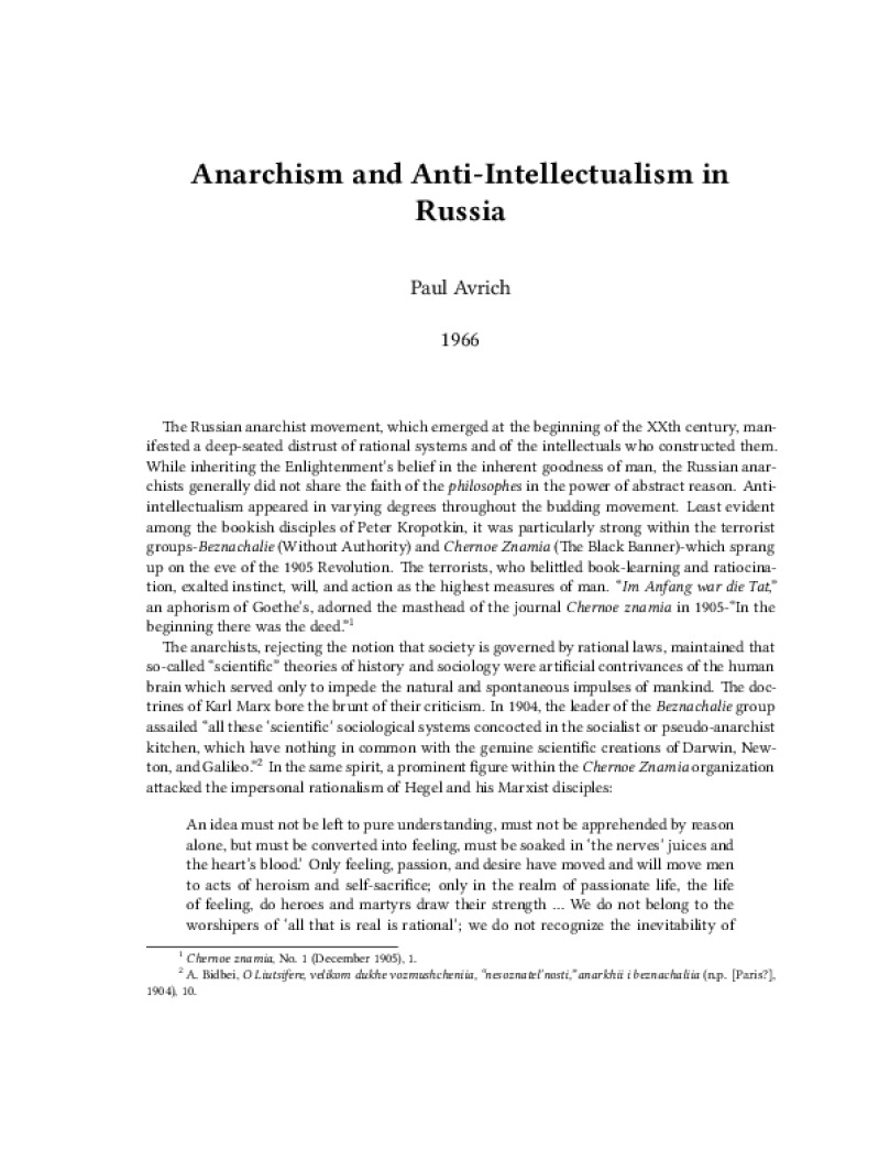 Zine Anarchism and Anti-Intellectualism in Russia Author: Paul AvrichPublished: 1966Language: enCatalog: The Anarchist Library9 pages. Read online: html • pdf •imposed pdf • a4 pdf • epub • muse • tex Share: We mail all zines to incarcerated people for free.