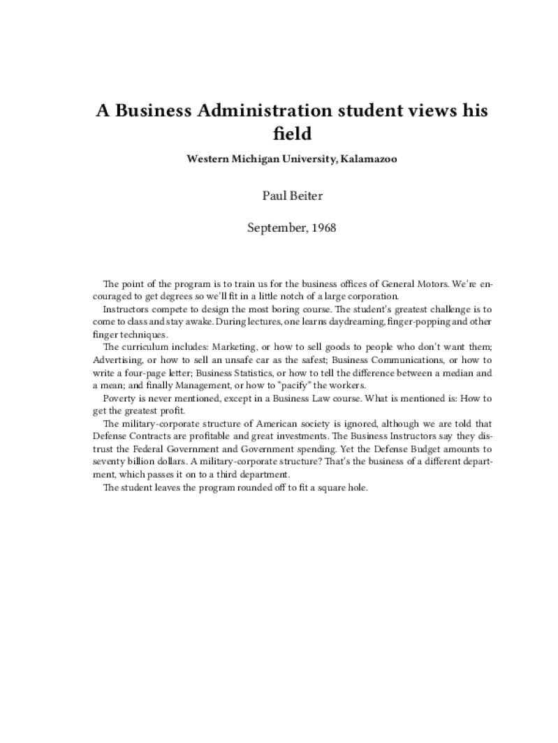 Zine A Business Administration student views his field Author: Paul BeiterPublished: September, 1968Language: enCatalog: The Anarchist Library2 pages. Read online: html • pdf •imposed pdf • a4 pdf • epub • muse • tex Share: We mail all zines to incarcerated people for free.