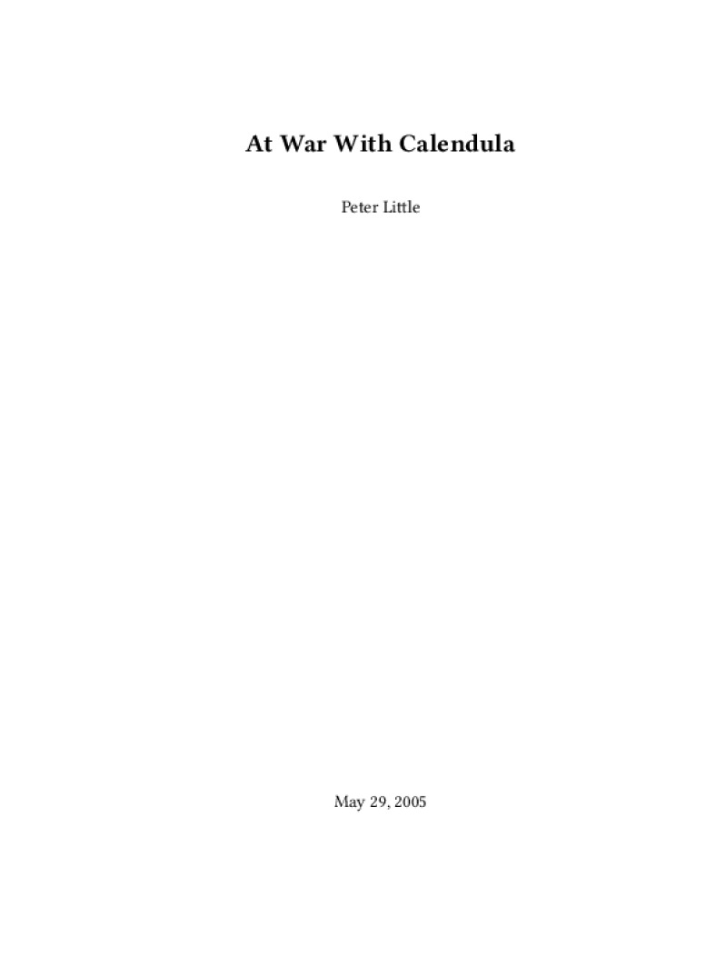 Zine At War With Calendula Author: Peter LittlePublished: May 29, 2005Language: enCatalog: The Anarchist Library8 pages. Read online: html • pdf •imposed pdf • a4 pdf • epub • muse • tex Share: We mail all zines to incarcerated people for free.