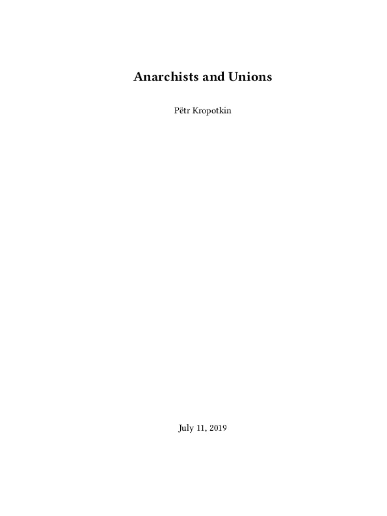 Zine Anarchists and Unions Author: Pėtr KropotkinPublished: July 11, 2019Language: enCatalog: The Anarchist Library13 pages. Read online: html • pdf •imposed pdf • a4 pdf • epub • muse • tex Share: We mail all zines to incarcerated people for free.